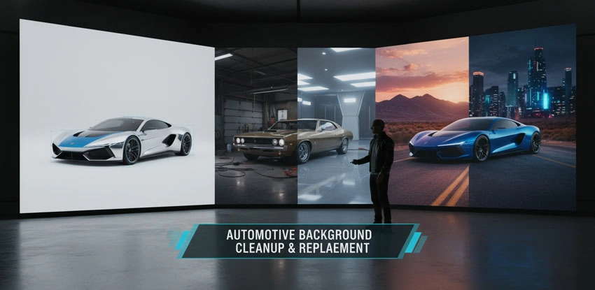 It is the professional enhancement of car images for listings, dealership websites, ads, and marketplaces. It includes cleanup, color correction, reflection control, shadow refinement, and consistency improvements.