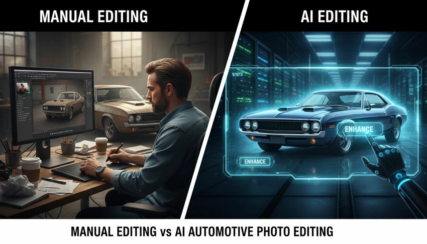Not always. AI helps with speed, but car images often need human correction for reflections, body lines, shadows, and color accuracy.