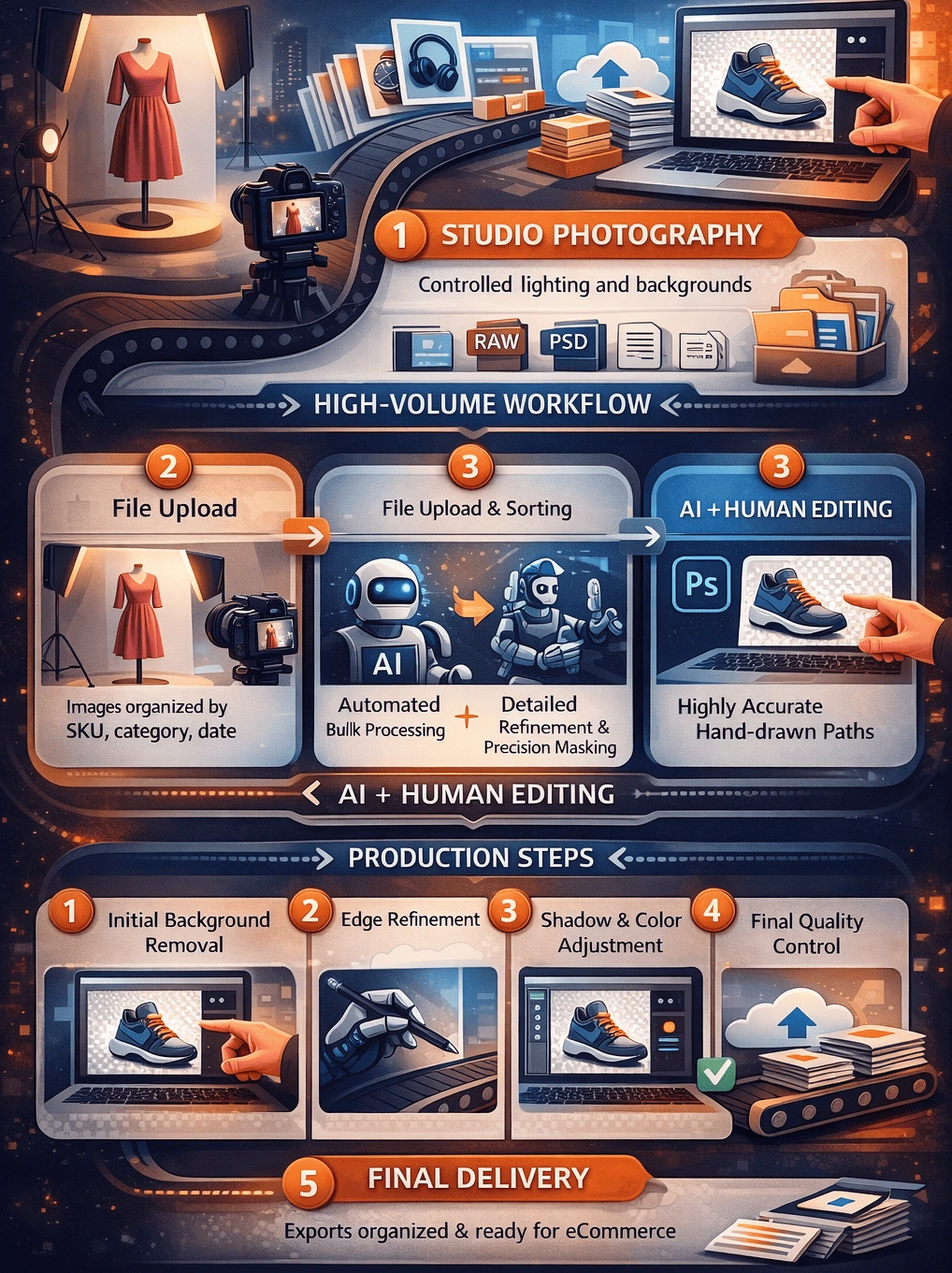 But behind those images is an enormous production machine. eCommerce brands process thousands of product photos monthly. They must meet strict image standards.
