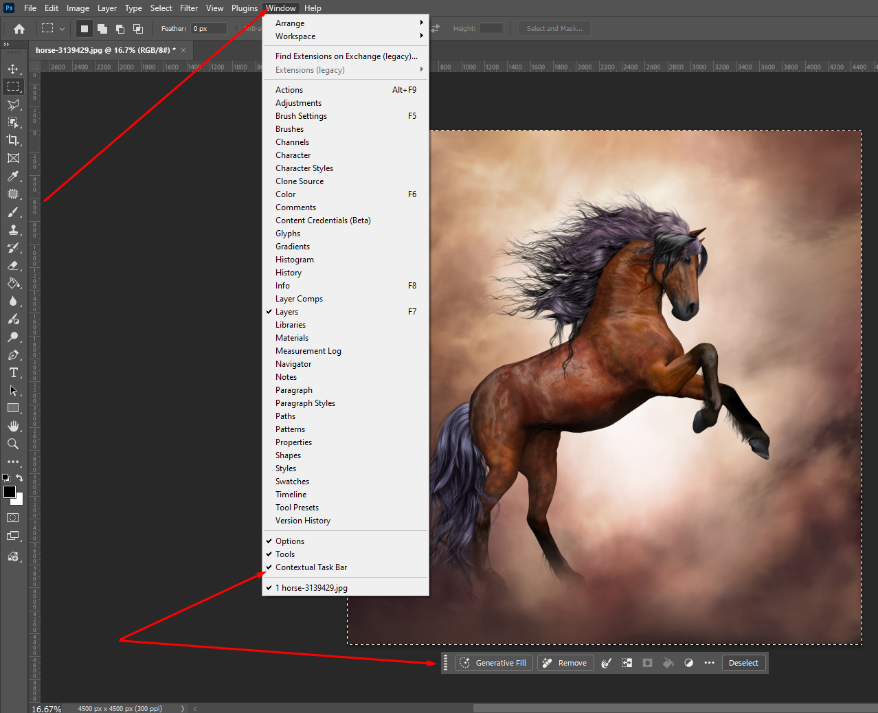 Select any area using Lasso Tool (L) or Marquee Tool (M), look below the image, you will see Generative Fill, Type a prompt or leave it empty, and finally Click Generate.
