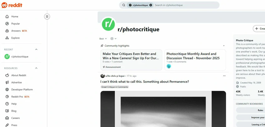 r/photocritique is a fast, blunt feedback forum where photographers get quick, practical responses. Best for those who want a rapid critique of single images and clear improvement points.