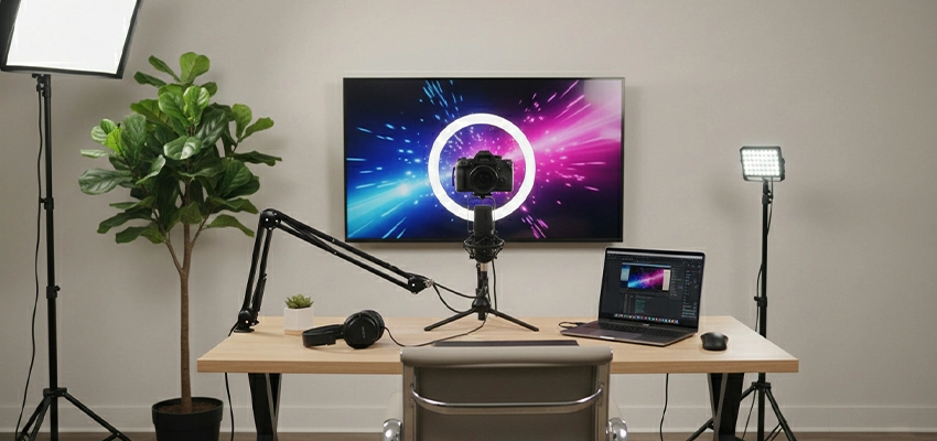 Audio matters less here. Wait, it still matters, but your backdrop gets judged first. Softbox lights. Clean background (fake plants optional but effective). Camera at eye level. This setup lives or dies on YouTube/Instagram.