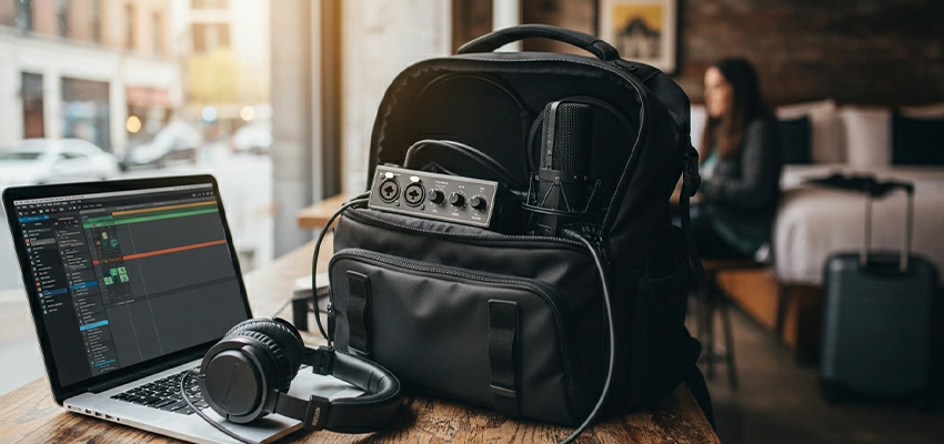 Backpack. Interface. XLR mic. Laptop. Record at coffee shops. Guest homes. Hotel rooms between conferences. Portability trades against consistency. Every room sounds different.
